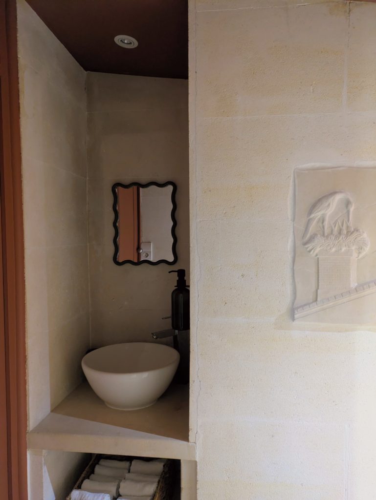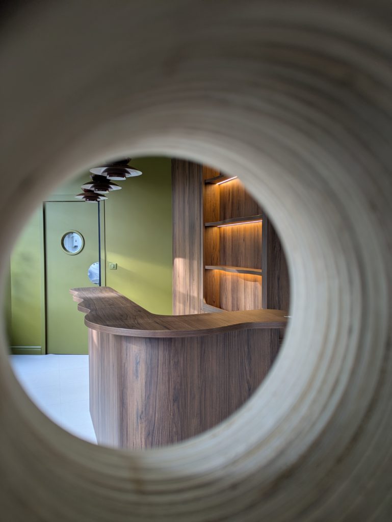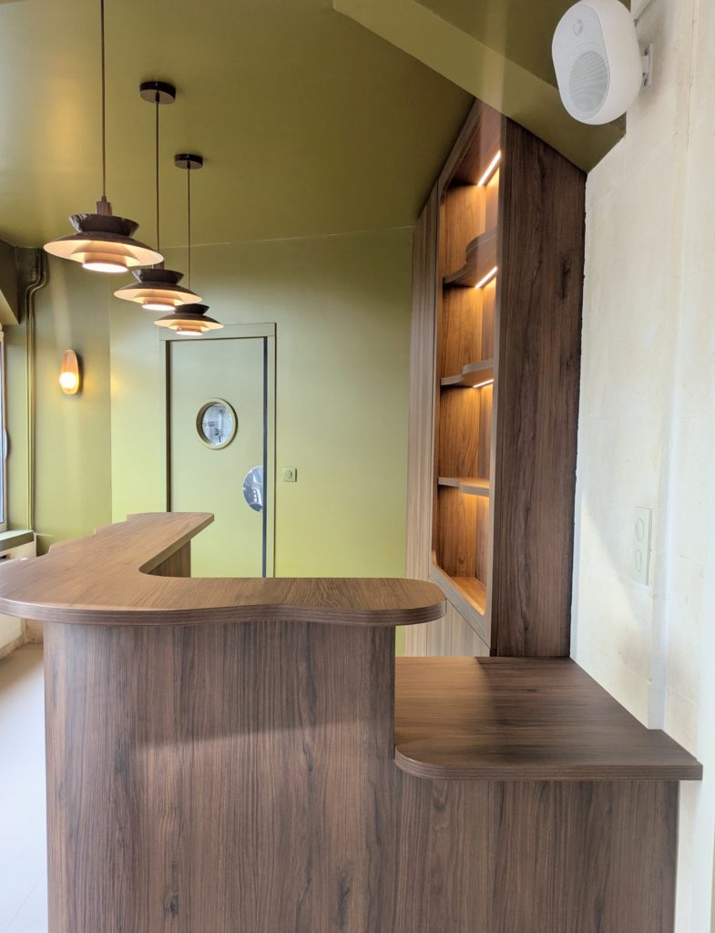 Les lignes courbes du comptoir en bois réchauffent l’espace, tandis que la palette vert olive enveloppe la pièce d’une atmosphère à la fois contemporaine et apaisante.
