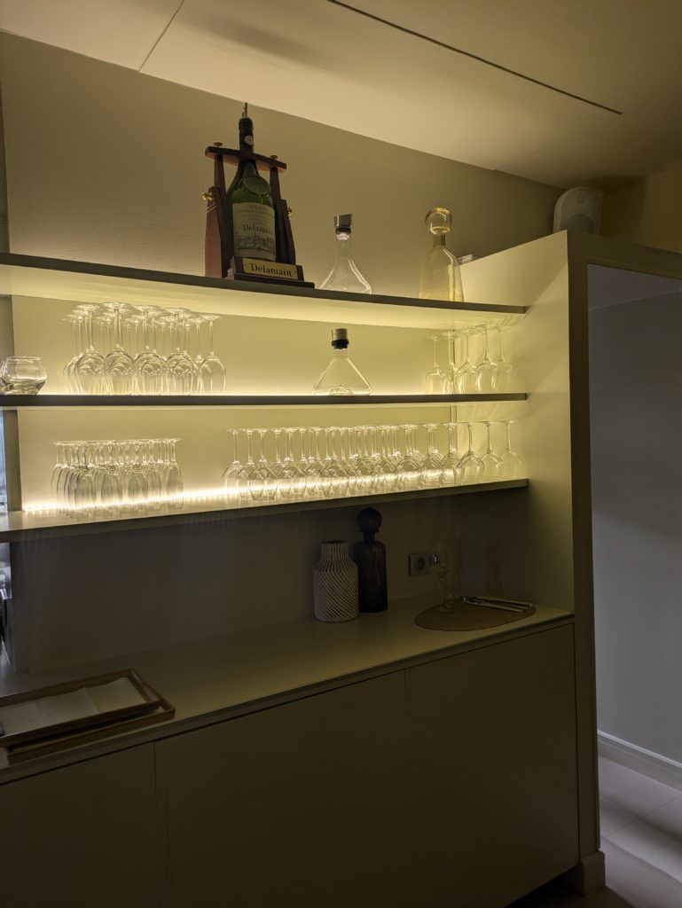 La lumière naturelle, amplifiée par les larges ouvertures vitrées, révèle les textures et crée un jeu d’ombres qui évolue tout au long de la journée. Les suspensions au design sculptural viennent ponctuer l’espace et structurer la hauteur sous plafond. Un dialogue entre matière, lumière et formes pour transformer un simple accueil en véritable signature intérieure.